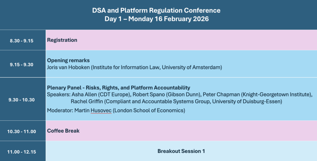 The conference brings together speakers from academia, civil society, regulators, industry, and legal practice. It features 100 papers, which selected authors will present across five breakout sessions, as well as a poster session on the DSA’s risk-based approach. Other themes include DSA politics and enforcement, access to data for researchers, user redress and reporting mechanisms, content moderation, and the DSA’s intersections with AI and the regulation of digital markets.